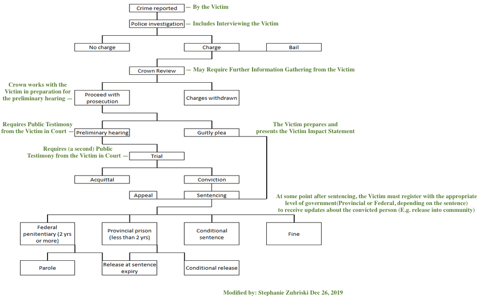 Whether in the court or to seek compensation for counseling, I am called upon to provide my testimony over and over and over again. Not only do I feel like a tool in the crown’s toolbox that is but one used to build a case, but there is an expectation for me to be vulnerable and also be completely fine with not having any choice about when or how I can be vulnerable. I feel that the authorities in this situation consider it to be my civic duty to provide my testimony in a court of law so that it can be decided if this person that manipulated, abused and sexually assaulted me should be punished. Not because of what they did to me but in order to prevent further risk to society. The crown represents the public remember, I am only one person. The Judge/Jury will decide if there is enough evidence to believe that the person who assaulted me actually did and is a ‘real’ risk to society. I have added to the flow chart provided by the Office of the Federal Ombudsman for Victims of Crime (in green) points where I, as a victim was expected to play some kind of a role.